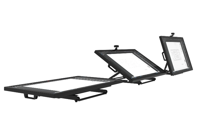 The tabletop display supports a range of working positions, from fully flat to steeper viewing angles, allowing users to choose the posture that best suits the task at hand. Flat mode is useful for tabletop-style review and markup, while angled positions support seated or standing plan review.